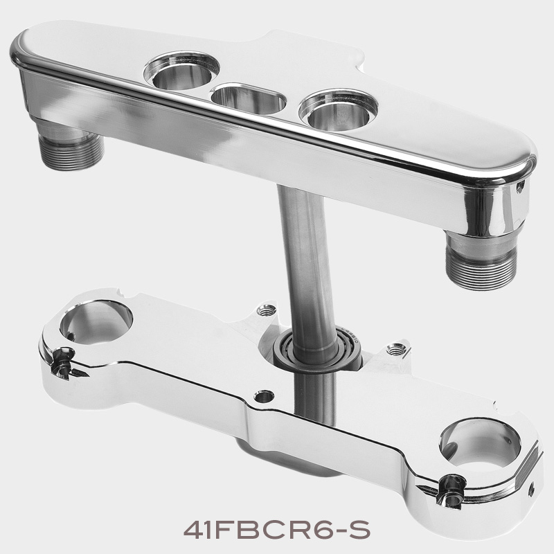This HHI raked triple tree kit fits all 1984-2017 Fatboy, Heritage, Deluxe and Slim models. They are designed to accept the original tin covers and headlight or full Nacelle so you can maintain the stock look while increasing fork rake and overall wheelbase length. Kits are available in both 4 and 6 degree rakes, with or without extended fork covers and fork extensions. The 4 degree rake kit is typically used when installing a 21" or 23" front wheel and the 6 degree kit is recommended for installing a 26" wheel. Both of these applications do not require the extended fork covers.