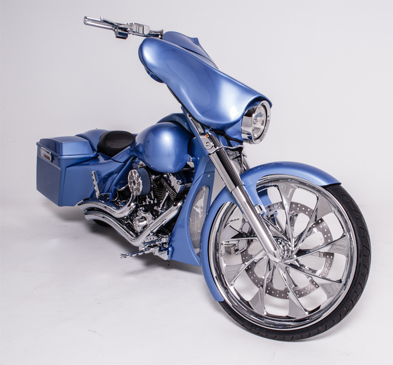 The HHI Billet Touring Fork Leg Conversion Kit with Torpedo end cap fits 2014-23 and new style 2024-up FLH models. This kit features a hidden axle, contoured axle spacers and a custom fender mount with adjustable height for 21 inch wheel fitment.  Also features a 4 bolt fender mounting system for custom fenders providing maximum strength and fender rigidity.  The Fork Leg Conversion kit comes in Black or Chrome Finish and single or dual disc caliper mounts. HHI Billet lower leg kits are interchangeable with stock Harley Davidson internal components or most upgraded suspension parts.