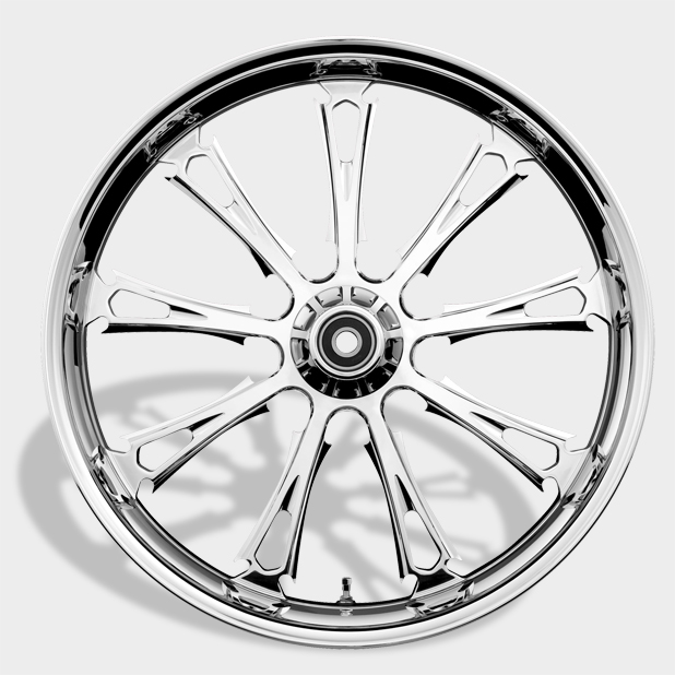 HHI / Renegade’s visionary LAREDO is a striking addition to our cutting-edge wheels. This 9-spoke gothic-influenced style wheel provides an imposing visual effect to any Chopper, Bagger or Wide Tire Bike without “gaudy” overkill.
