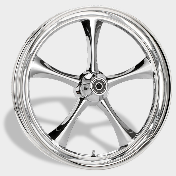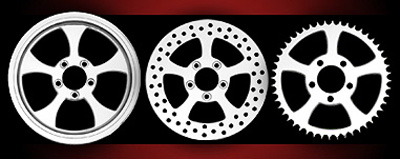 Most Renegade wheel designs are available in Chrome, Phantom-Cut, Black Powder coat and our new custom colour finishes of Aztec Red, Cobalt Blue, and Inca Gold. Diameters available in 16” thru 32”, now available in 18, 21 & 23 x 5.5 Front Wide Tire sizes! Matching Sprockets, Pulleys, Derby Covers and Air Cleaners are available.
