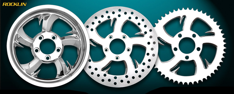 The Rocklin looks amazing on a Custom Build or Touring Bike with its unconventional 5 swept spoke design with barbs aggressively leading the way. The wheel is delivered in 16" to 32" sizes and now our new 18, 21,& 23 x 5.5  Wide Tire Front Wheel. The Rocklin design wheel has a matched air cleaner, pulley or sprocket available to compliment your build.