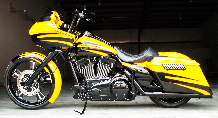 Build #27 Road GlideRaked HHI (7°neck, 7° trees) 23" Cabo contrast cut wheel, HHI Bomber lower legs, HHI Bars, HHI Twin Cam Side cover, HHI calipers, HHI forward controls.
