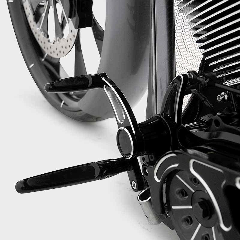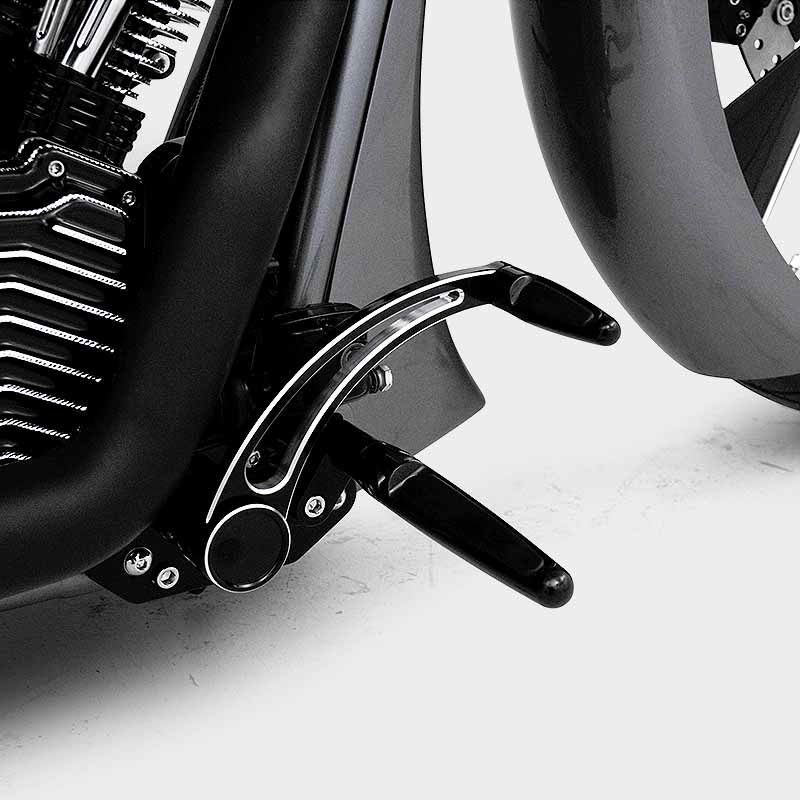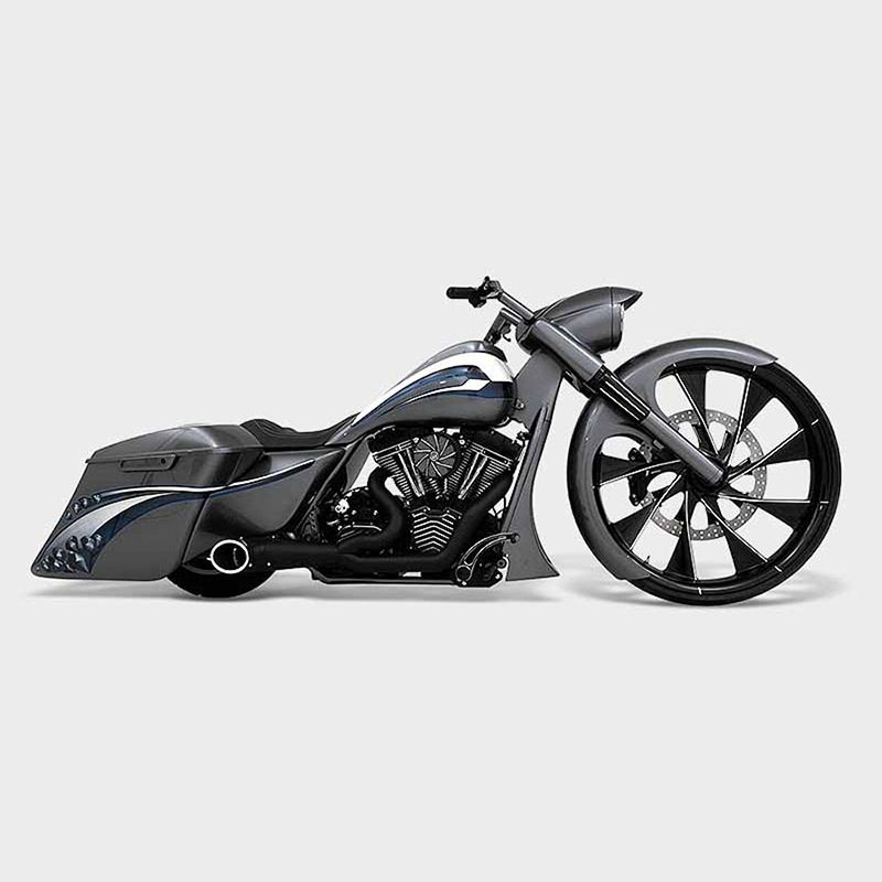 Build #53 09 Road King. 30" Renegade Whistler Phantom Cut Wheel, HHI Hammer Lower legs, HHI Billet Tri-Line +3" Fork Covers, HHI 7" Speed King internally wired Handlebar system, 18" Matching Rotor, HHI 6 piston Caliper, HHI Forward Controls, HHI Short Neck Builders Kit, HHI 30" Wrap Fender, Freedom Performance 2 into 1 Turnout Exhaust, HHI Nacelle.