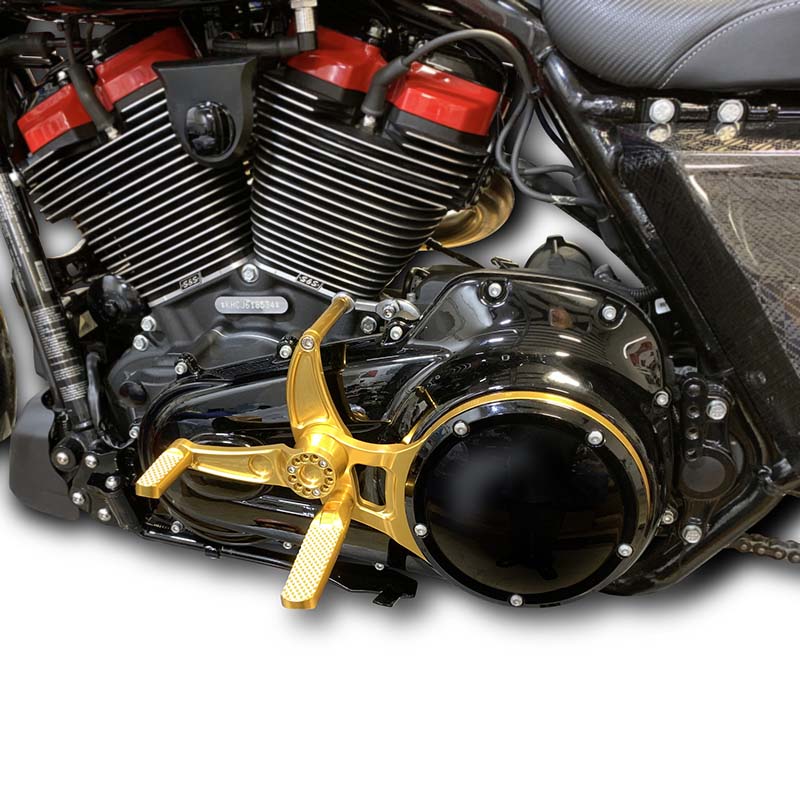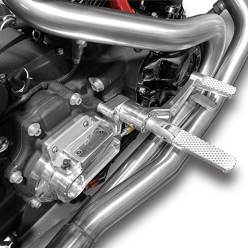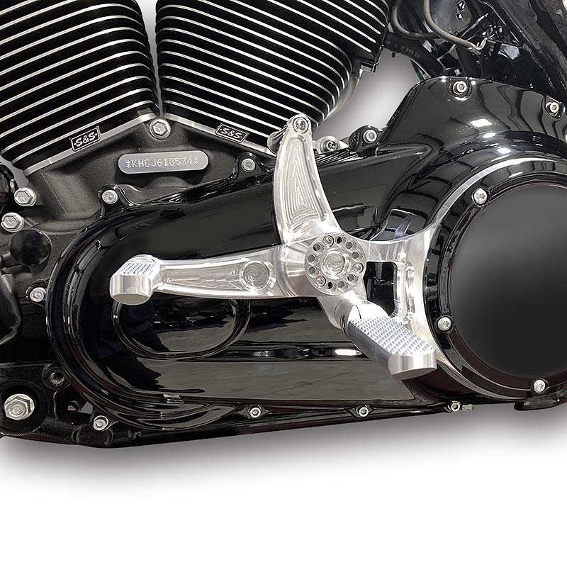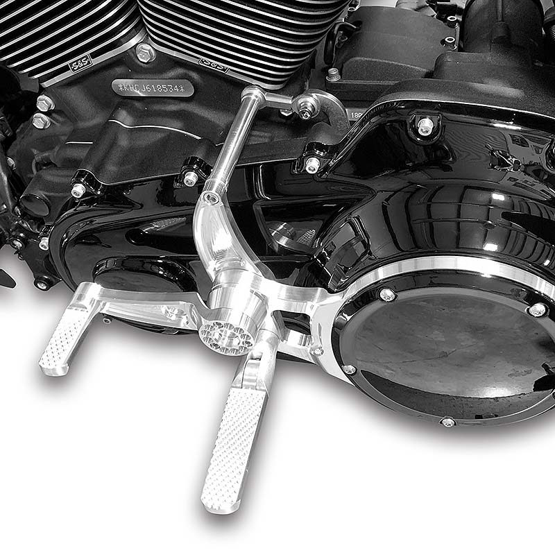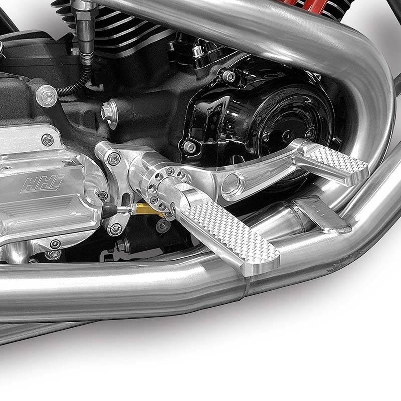 Works with either cable or hydraulic Touring Bike clutch applications and includes new aggressive HHI custom knurled pegs.  Controls can be ordered without foot and toe pegs.  This option will include a set of early style female clevis accepting most any male mount folding foot peg.  Toe pegs will need threaded holes for 5/16" screws.