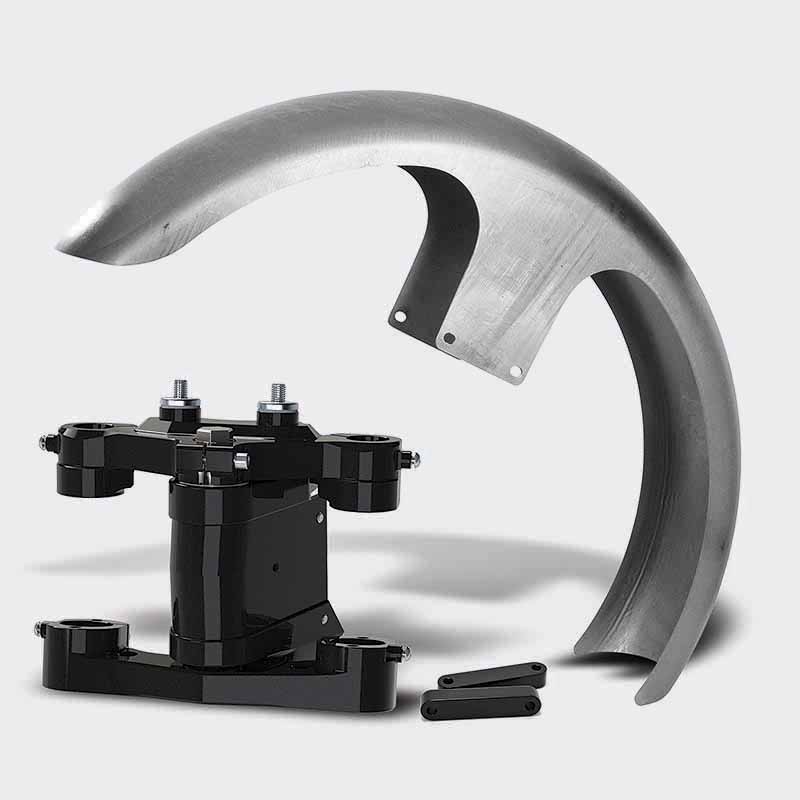This X-26® Bolt-On Neck Rake Builder Kit includes our X-26® Bolt-On Neck Rake Kit, choice of slim wrap steel fender or stock style FL steel fender & fender spacers available in chrome or black finish.