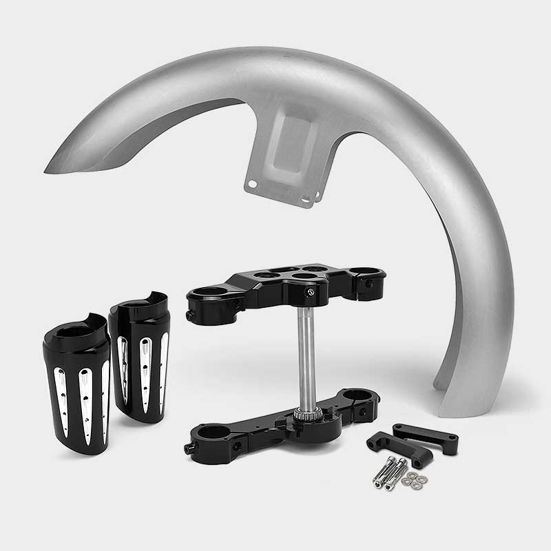 FL Softail Builders Front Kit for 21", 23" and 26" wheels. Fits all 2017-earlier FL Softail Models. This kit comes with fender, fender spacers, triple tree, and HHI billet fork covers.