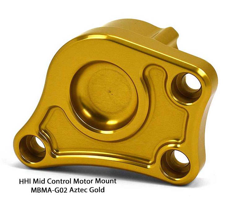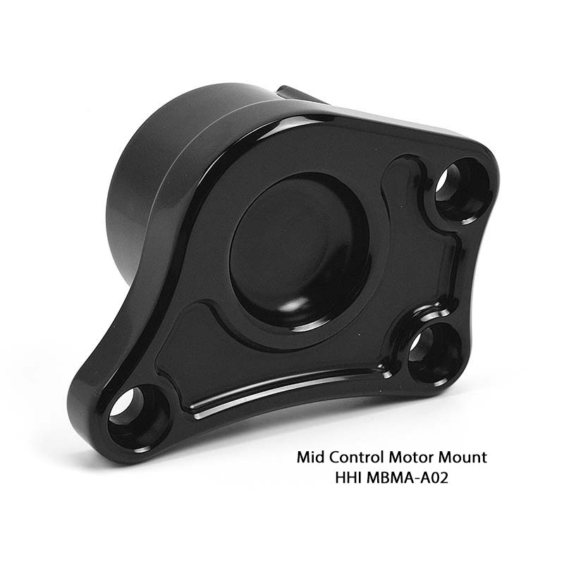 The New HHI Custom Motor Mount Bracket replaces the front right side factory motor mount & brake control bracket when installing HHI's New Mid Controls. Remove that factory cast iron mount and replace it with our super clean and stylish 6061 billet aluminum design. This stunning innovative design not only saves weight but delivers a much sleeker custom look and streamlines the mount.