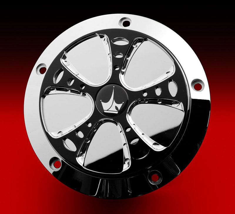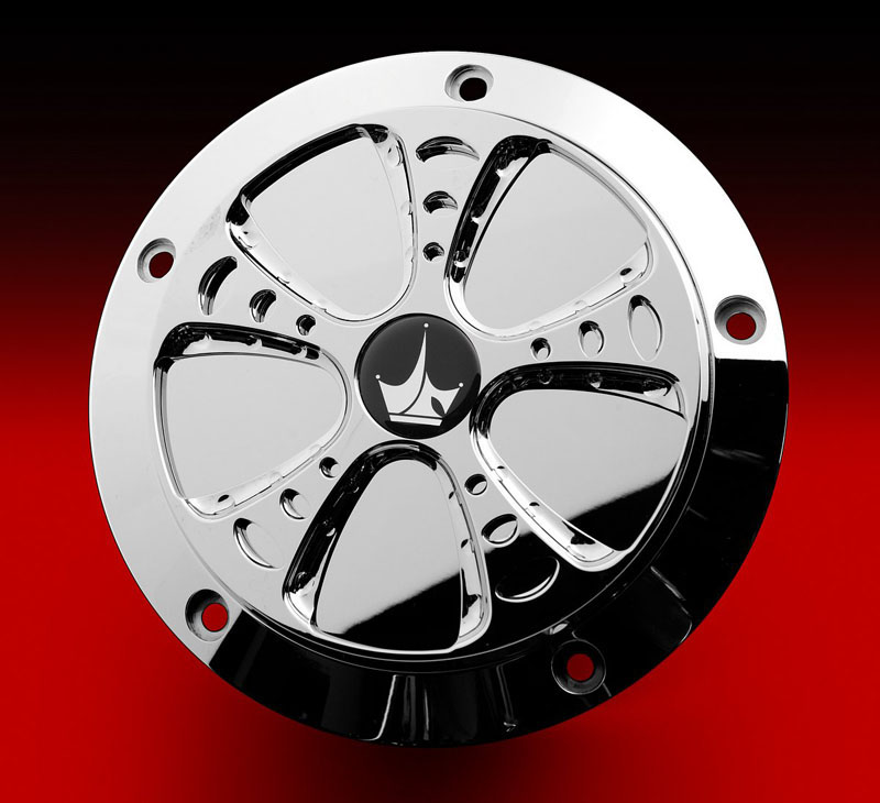 The Renegade Derby Cover is a stunning two piece engineered design. This allows our customers to choose the perfect combination of finishes to complete their bike with. The Derby Base Plate and the Derby Cover are machined from T6061 aircraft aluminum by craftsmen here in the USA. Both the base & cover come in show chrome or black anodized phantom cut and of course we offer cover designs to match all our Renegade or HHI wheel designs.