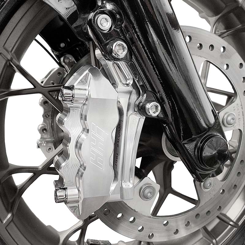 HHI mounting adapters for radial-mount calipers to stock fork legs, and HHI Dominator Legs are available here.