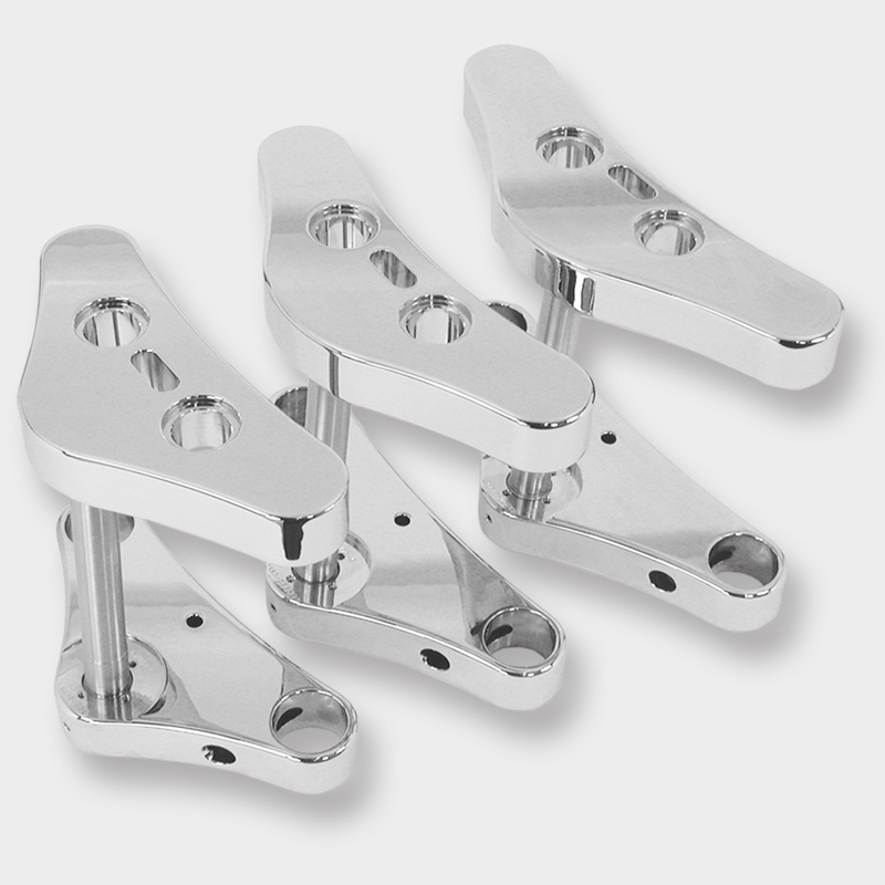 HHI offers an industry leading triple tree product line, precision machined in our plant and then treated to a variety of show quality finishes. Our trees have a smooth top design hiding the fork tube and neck stem bolts for a true custom look. Our design utilizes hidden clamp bushings in the lower tree and a double ended insert threaded into the top of each fork tube to provide a clean, positive method of assembly. With generous corner rounding, large radius leading edges, no ball mills or logo's, our triple trees have the best look and at 1 1/2" thick give you the strength needed to provide lasting performance.