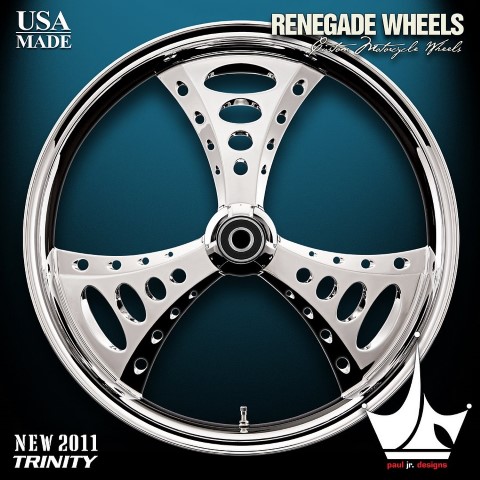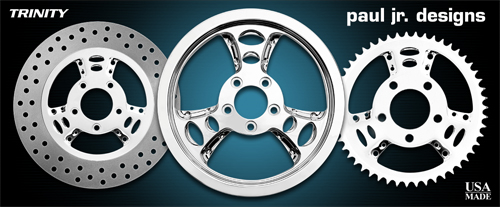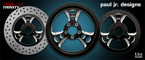 The Trinity is from the part of the Paul Jr. Design series. It boast a stunning 3 spoke design. It is a premium design and includes matching air cleaner, rotors and pulley. Please call for availability before ordering.