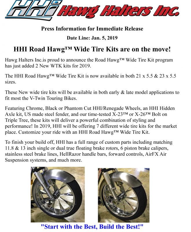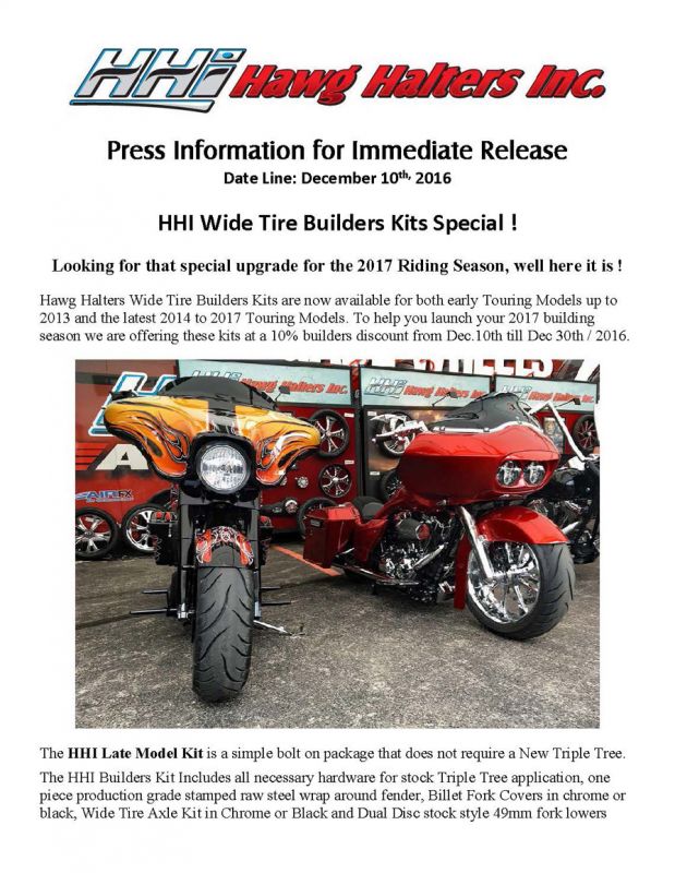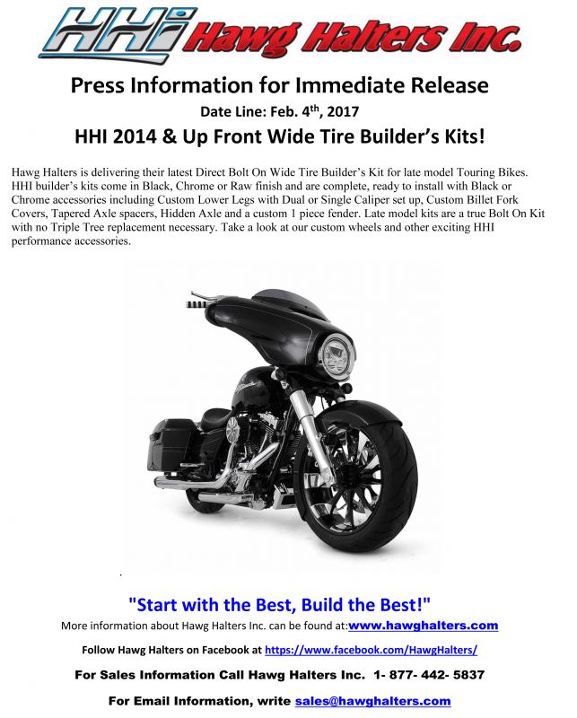 HHI proudly deliver the ORIGINAL Fat Front Tire Kit for touring bikes! This WIDE front tire kit allows you to run a 180mm tire up FRONT and compliments a 180mm rear tire perfectly. This kit fits 41mm front ends up to 2013 HD® touring models. New Kits for 2014 and later touring models are under development now.