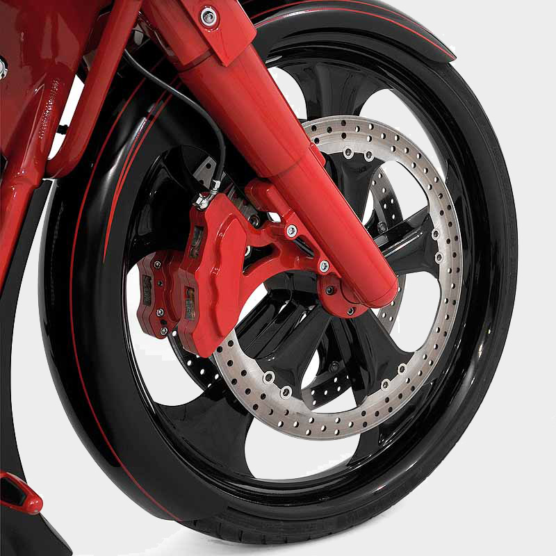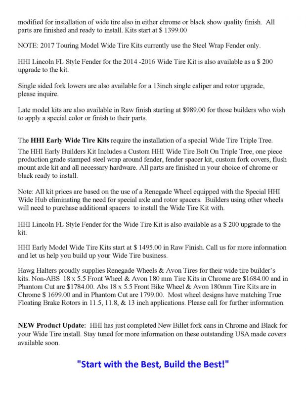 This Wide Tire Package can be ordered as a base kit with the special HHI Wide Triple Tree, HHI Hidden Axle for stock lowers, custom 180/200 Steel Wrap Style Fender, HHI Fender mounts, Spacers and all the hardware you need.  The base kit can be expanded with the addition of HHI Billet Lower Legs, with HHI Billet Fender mounts, and a wide range of single or dual HHI Billet Brake Caliper upgrades that include 4 or 6 piston differential bore calipers in 11.5, 11.8 and 13inch brake conversion kits with HHI true floating brake rotors.