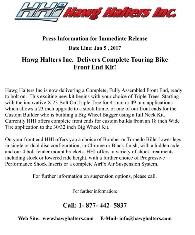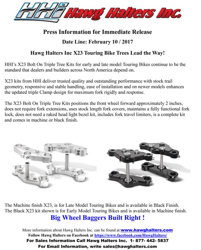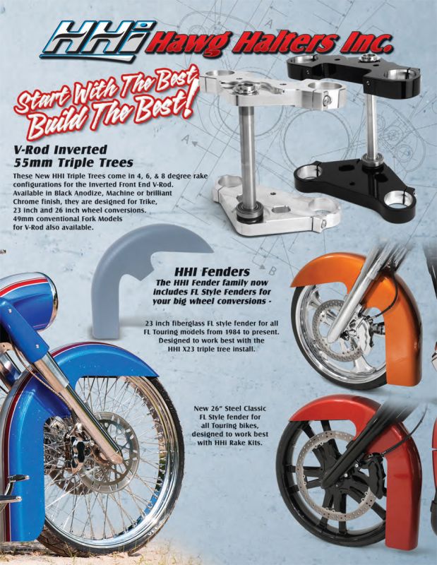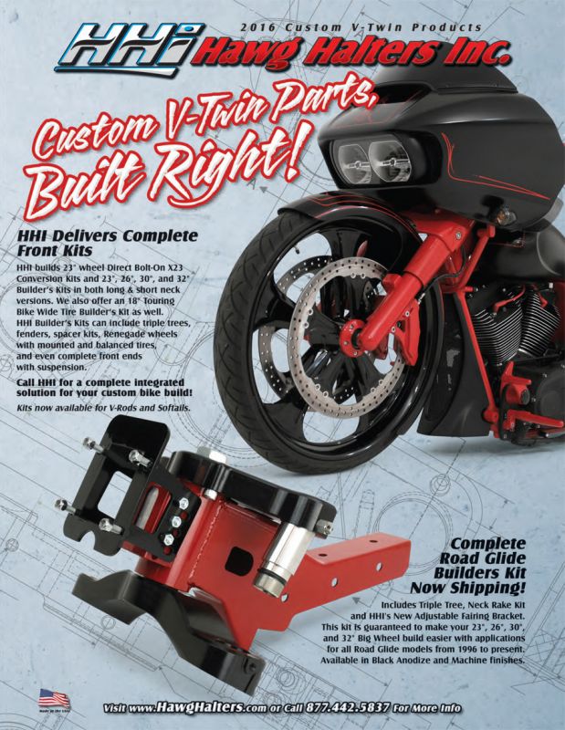 New for 2016 are our enhanced Bike build kits complete with Renegade Wheels, Avon Tires, a full range of Triple Tree conversion Kits including our highly successful X-23 Bolt On Kit for 23 inch wheels, and a full range of Neck & Triple Tree kits from 23 inch to 32 inch installations.