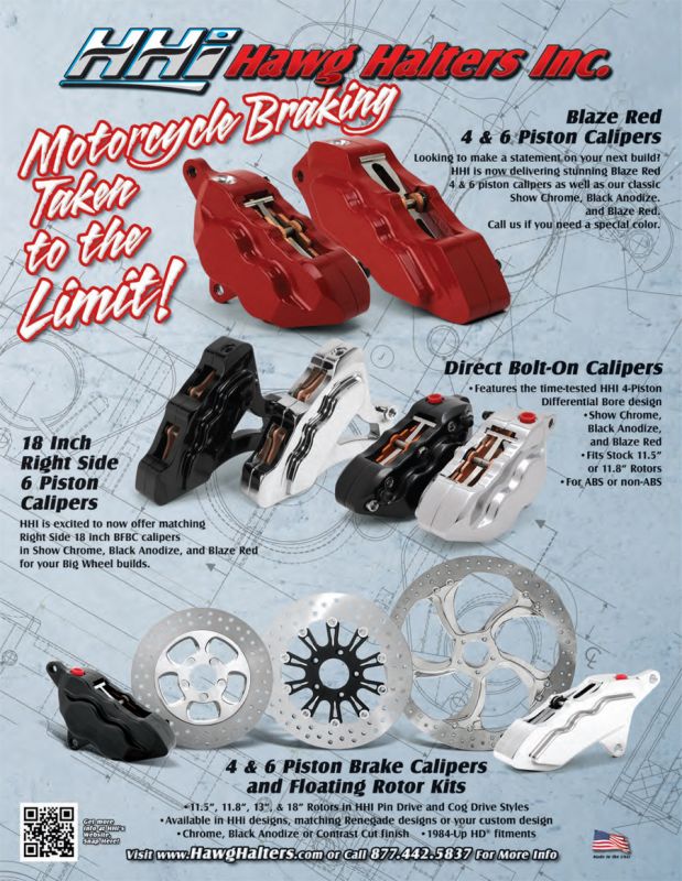 Hawg Halters wants to help you build your ultimate custom bike. Details make the difference and HHI is now offering our 4 & 6 piston brake calipers and brackets not only in Chrome or black but also in a variety of custom colors to help finish your bike off. We can even color match your brake rotor center sections if you want to. Call your rep and ask for further details.