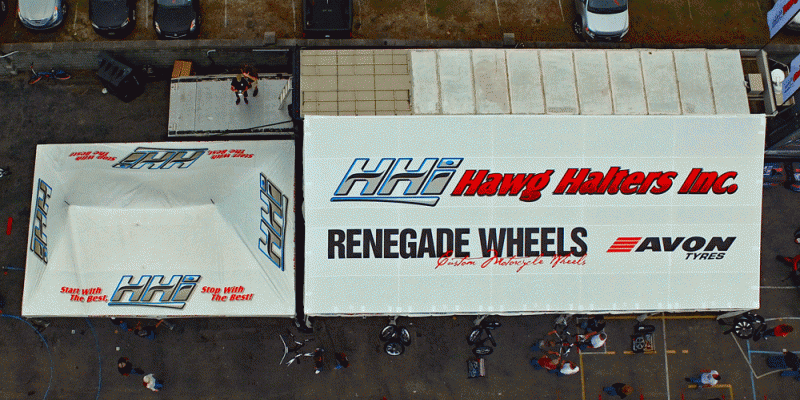 The Hawg Halters Crew set up and waiting to start installing Avon Tires, Renegade Wheels, all day long for our loyal rally customers.